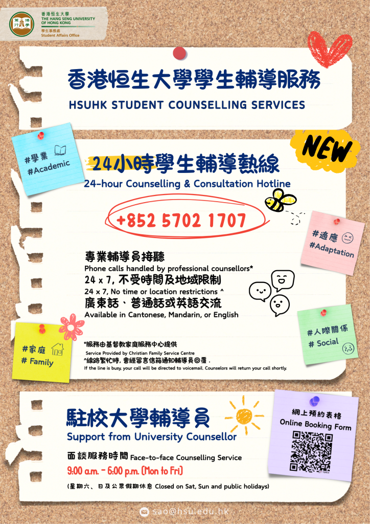 To better support students’ emotional well-being and mental health needs, the Student Affairs Office has established a 24/7 Emotional Support Hotline (5702 1707).